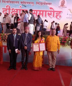 - दिनांक 10 नवम्बर 2025 दिन सोमवार को सिद्धार्थ विश्वविद्यालय, कपिलवस्तु, सिद्धार्थनगर के 9वें दीक्षांत समारोह में माननीय कुलाधिपति एवम राज्यपाल, उत्तर प्रदेश श्रीमती आनन्दीबेन पटेल जी द्वारा मनु लॉ कालेज, निचलौल की प्रतिभाशाली छात्रा *भार्गवी मणि तिवारी* पुत्री गोविंद तिवारी को एल-एल. बी.(विधि स्नातक) का स्वर्ण पदक प्रदान किया गया।